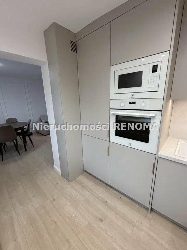 Duży, otwarty salon z wejściem do kuchni. Kuchnia wyposażona i zabudowana na wymiar (fronty od stolarza, szafki z cichym domykiem tzw. BLUM), wyposażona w sprzęty: płyta indukcyjna, piekarnik i mikrofalówka (w zabudowie), lodówka w zabudowie, pralko-suszarka, zmywarka - na gwarancji.