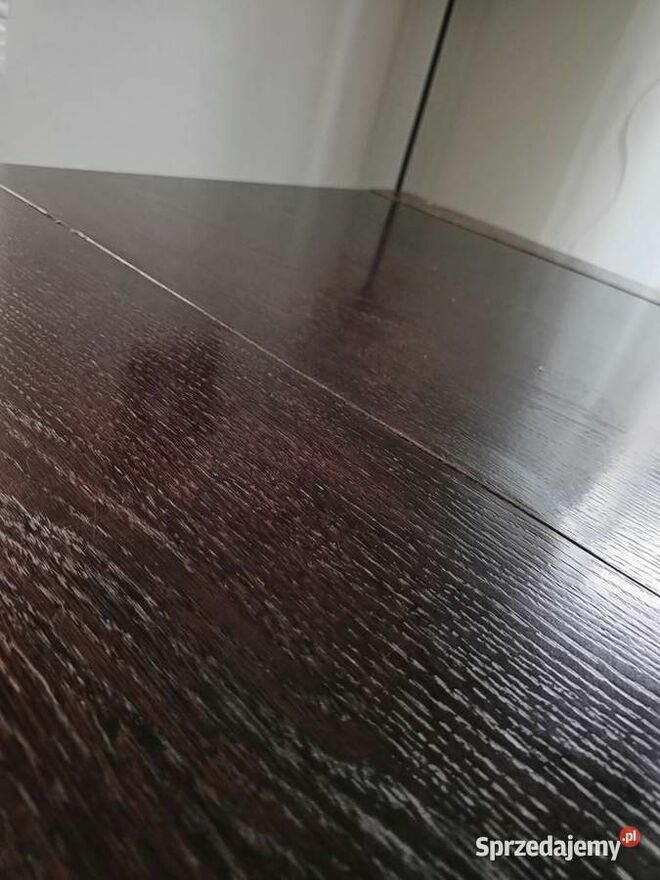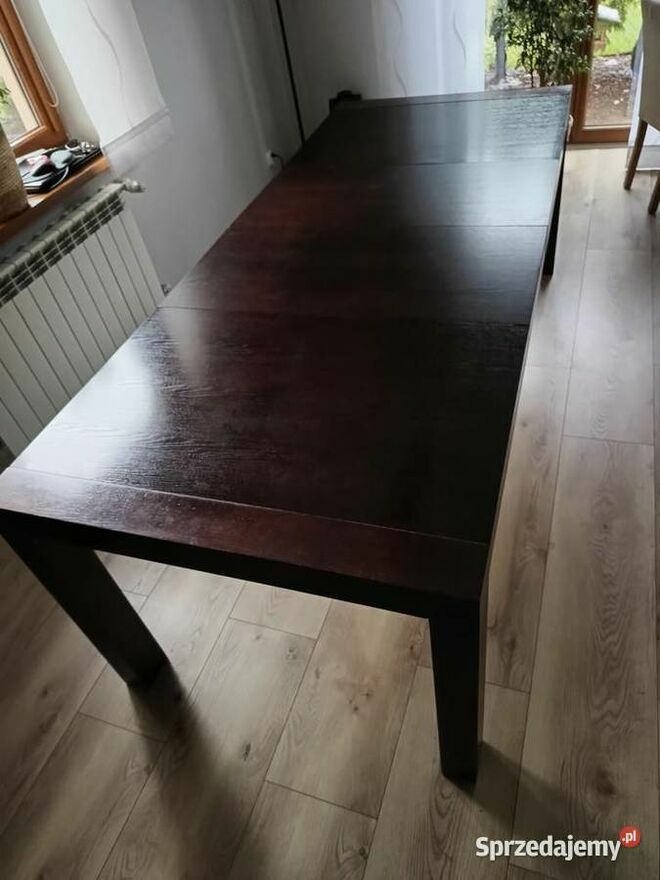 Solidny stół w ciemnym kolorze, idealny do salonu. Wymiar po złożeniu 1400x950mm. W zestawie dwa wkłady 450mm które pozwalają rozłożyć go do wymiaru 2300mm. Posiada delikatne uszkodzenia forniru na złączu stałych blatów, widoczne na zdjęciach. Stół rozkręcony w celu ułatwienia transportu. Tylko odbiór osobisty. PolecamSprawdź zainteresowanie tym ogłoszeniem
